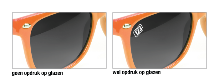 De kunststof glazen voor de zonnebrillen zijn van zeer goede kwaliteit, UV400.Dit kan desgewenst in verschillende tinten, standaard is een zwart verloop in de bril. De glazen kunnen natuurlijk ook zonder verloop geleverd worden. Uiteraard zijn ook volledig heldere glazen mogelijk, de zogenaamde nerdbrillen, maar ook spiegelglazen in zilver of in een kleur. Helemaal hip nu zijn de goud/gele of de paars/blauwe spiegelglazen!